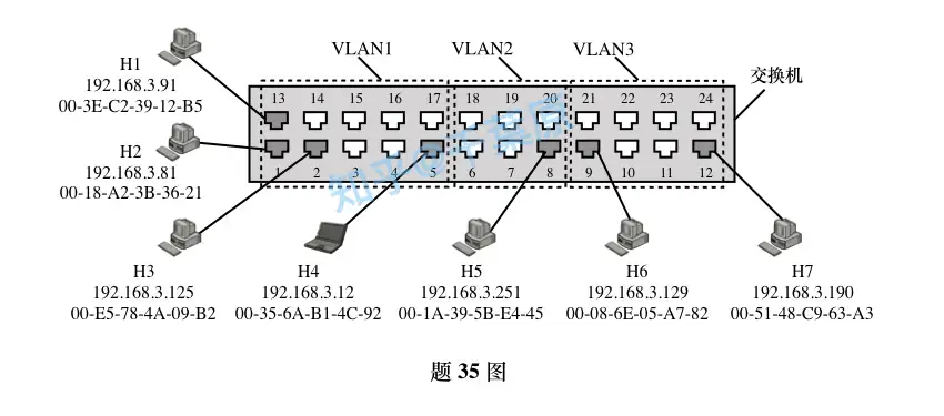如题 35 图所示的支持 VLAN 划分的交换机,已按端口划分了 3 个VLAN,部分端口连接主机的 IP 地址和 MAC 地址如图中所示,ARP表结构为:IP地址,MAC地址,TTL。